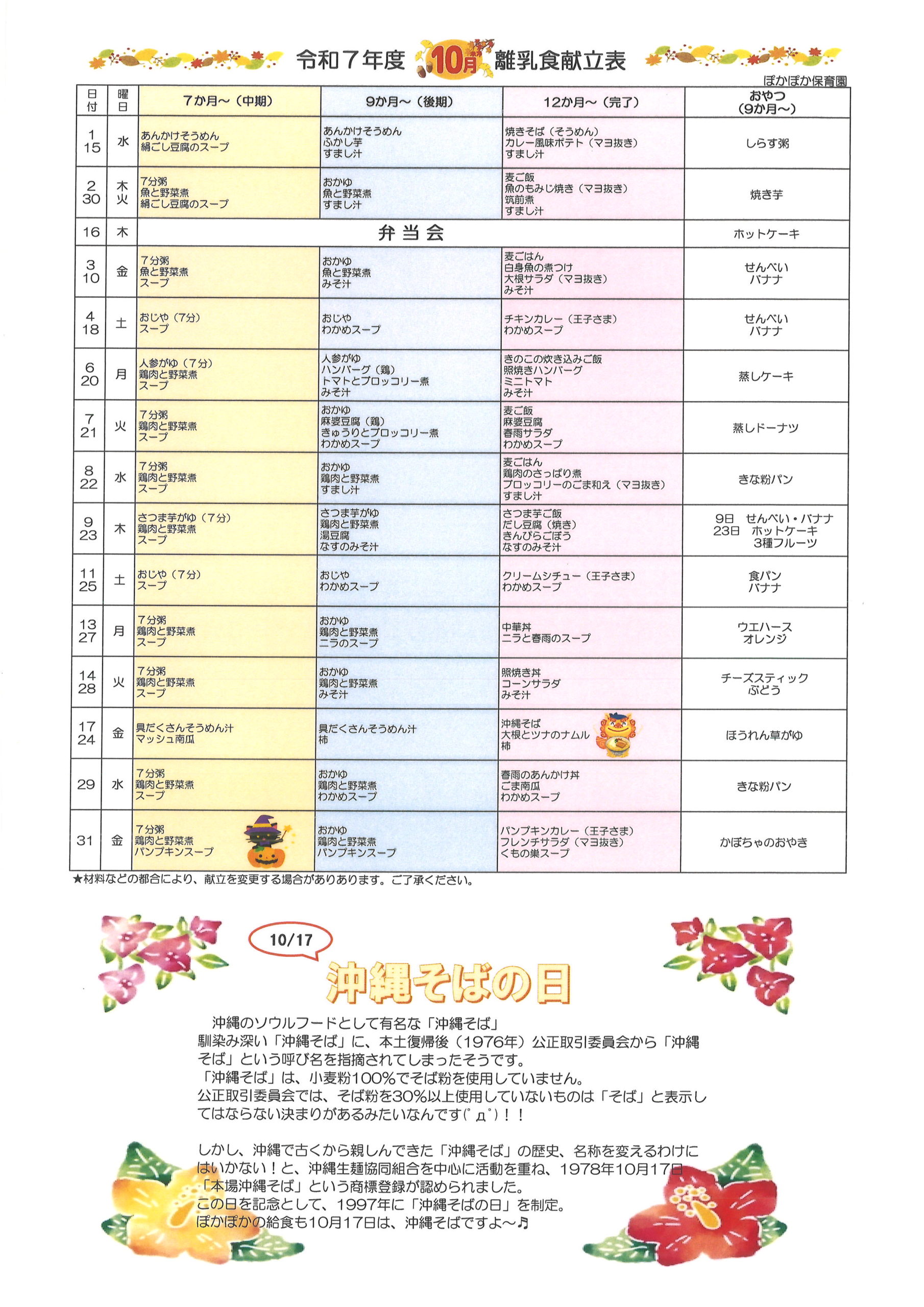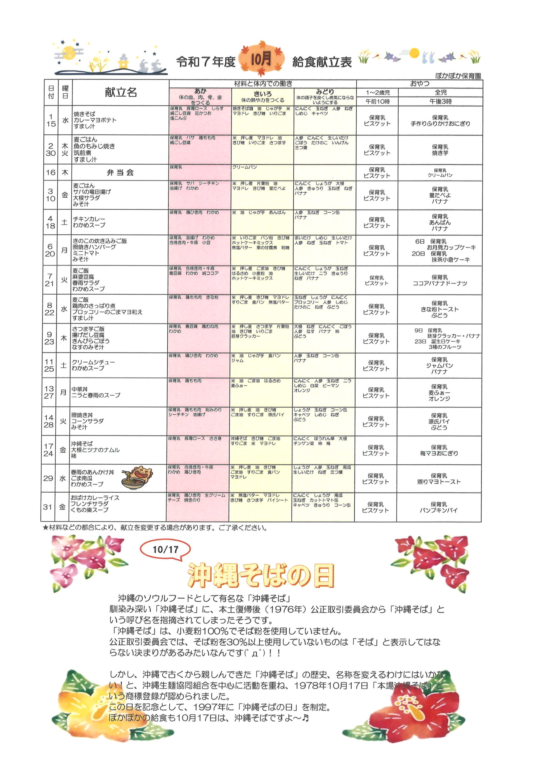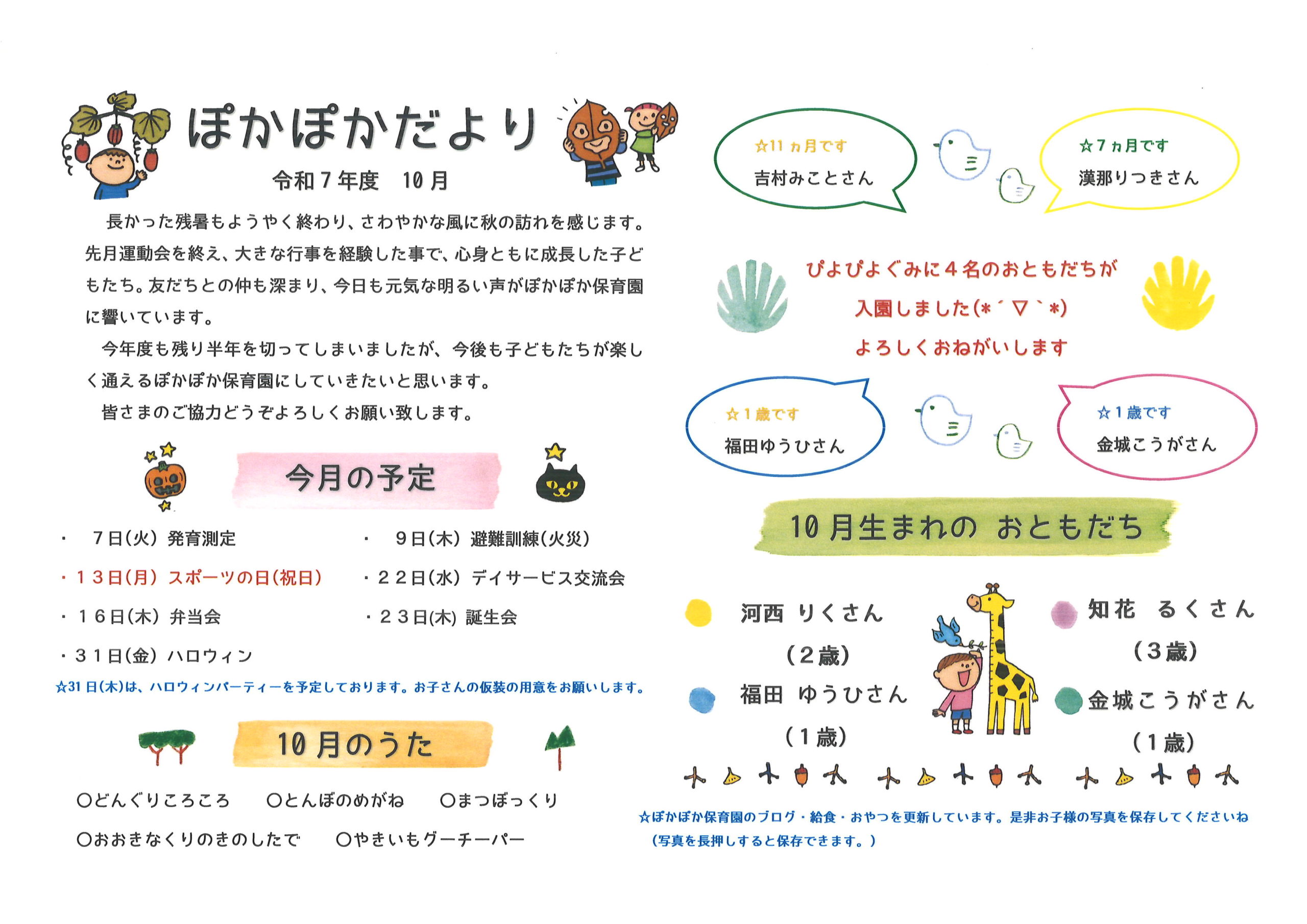 令和7年度 10月号 園だより 献立表